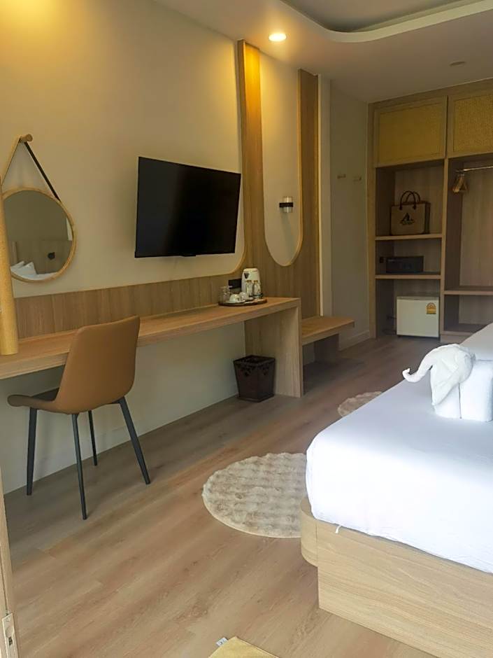 Deluxe Room is 301 square feet and includes a king-size bed 150-183 width plus balcony, cable tv, hairdryer, and safe.
